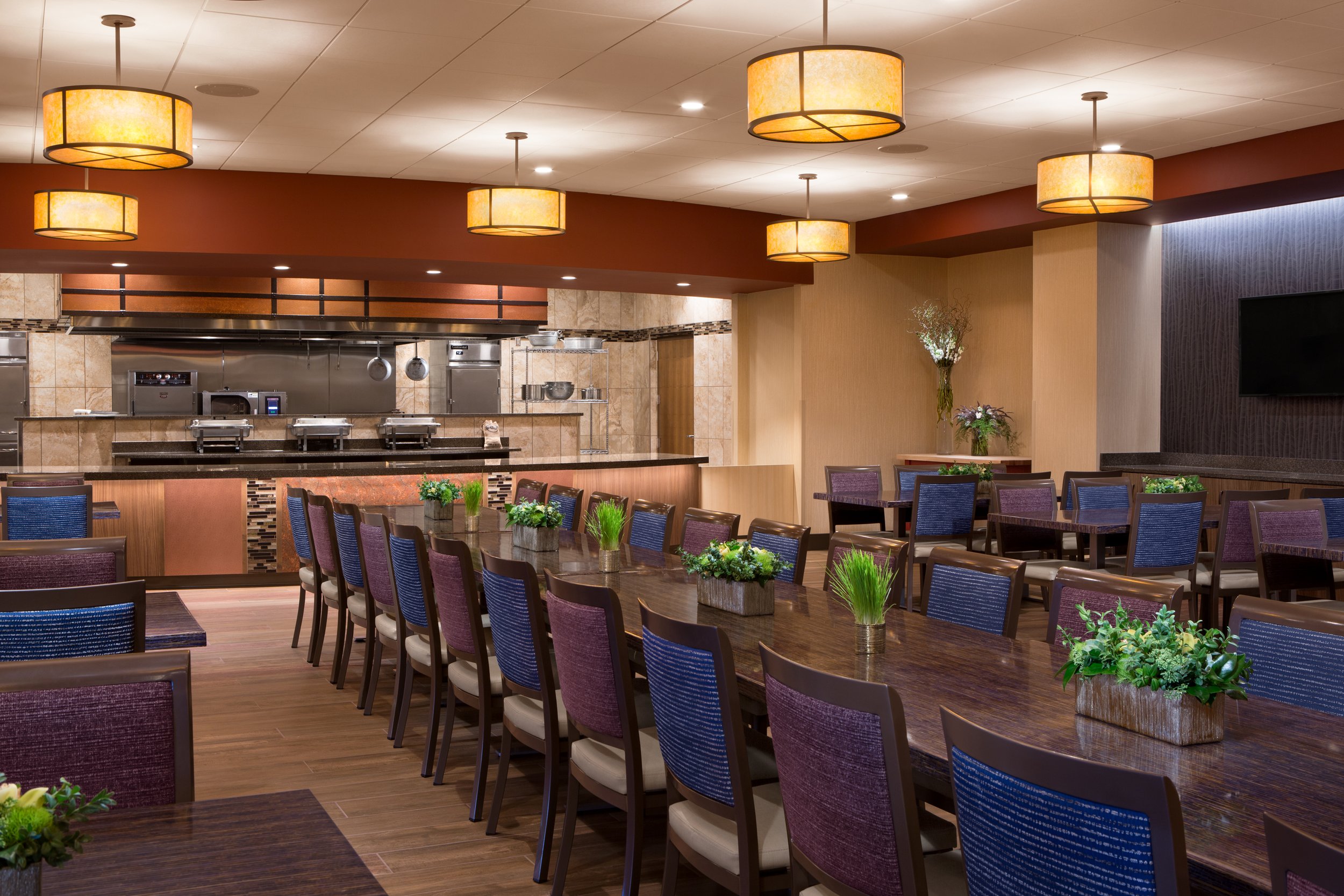 Repeated use of the circle, an important symbol for the community, can be found in room shapes, flooring designs, light fixtures and arrangements, furniture shapes and arrangements, and more.